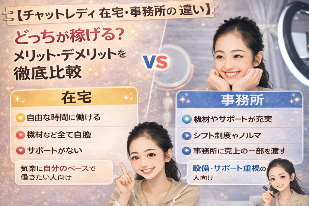 今日は、未経験さんでも迷わないように **在宅と事務所の“稼ぎやすさの違い”**を、メリット・デメリット込みでわかりやすくまとめますね!